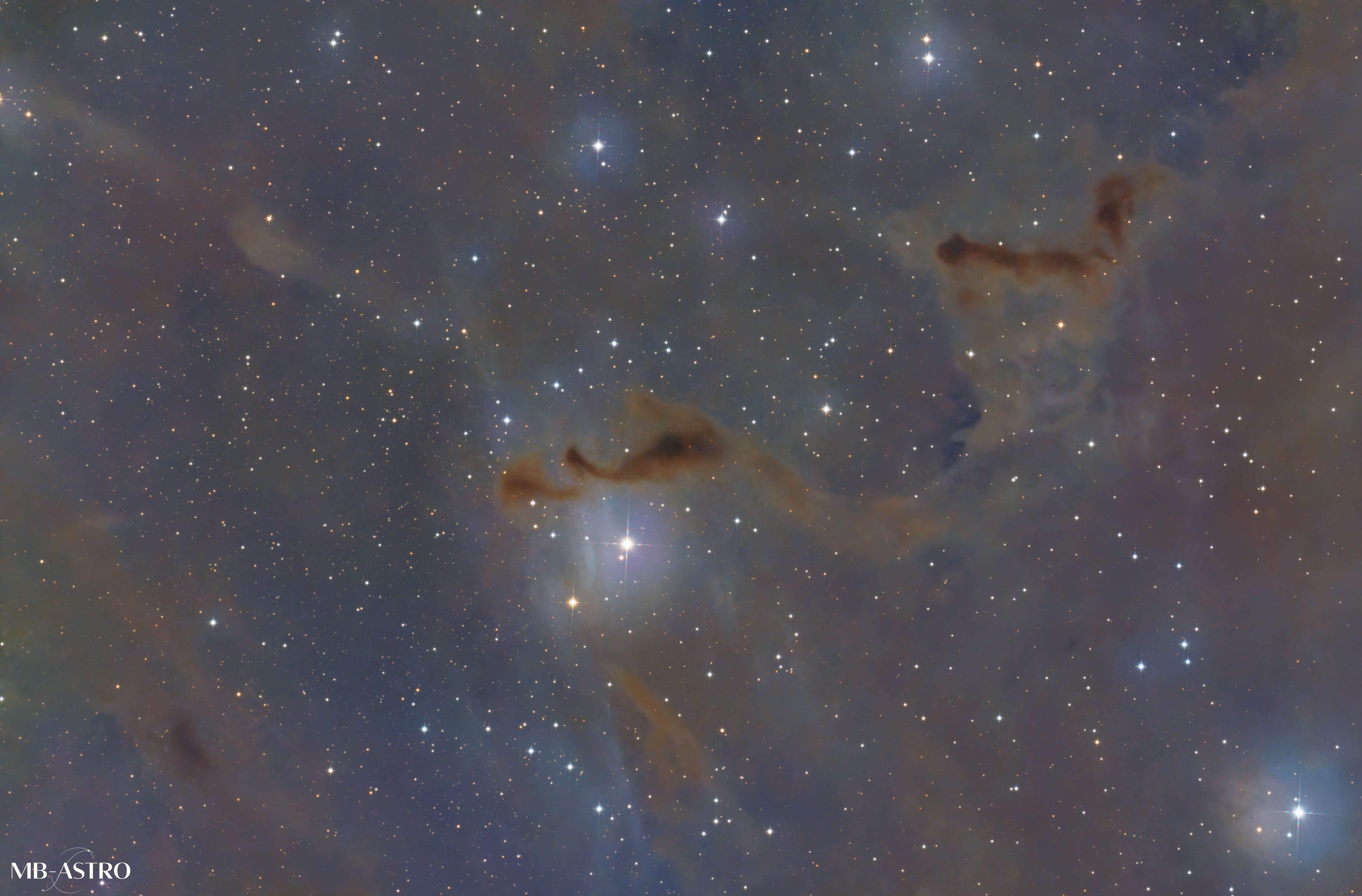 Neben den dunklen Staubwolken finden sich in der Region auch sehr schwache Reflexionsanteile. Feiner Staub streut hier das Licht junger Sterne was bei langen Belichtungen zarte bläuliche Schimmer sichtbar macht. Diese dezenten Aufhellungen bilden einen spannenden Kontrast zu den dunklen Bereichen und machen den Reiz des Motivs aus.