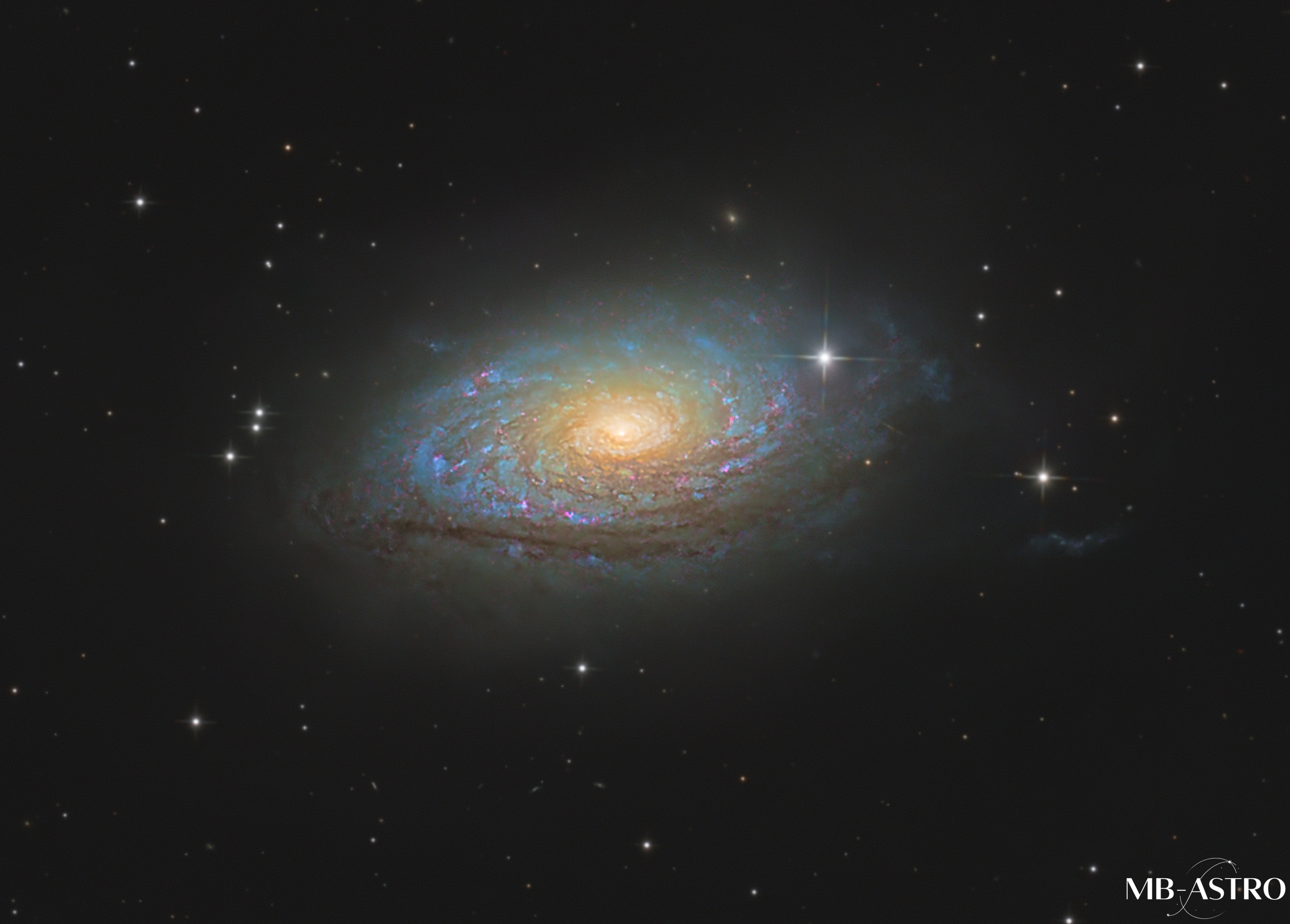 Messier 63, auch katalogisiert als NGC 5055, ist eine Spiralgalaxie im Sternbild Jagdhunde und liegt etwa 27 Millionen Lichtjahre von der Erde entfernt. Aufgrund ihres markanten Erscheinungsbildes wird sie auch die Sonnenblumen-Galaxie genannt. In der Astrofotografie zählt sie zu den faszinierendsten Spiralgalaxien des Frühlingshimmels.