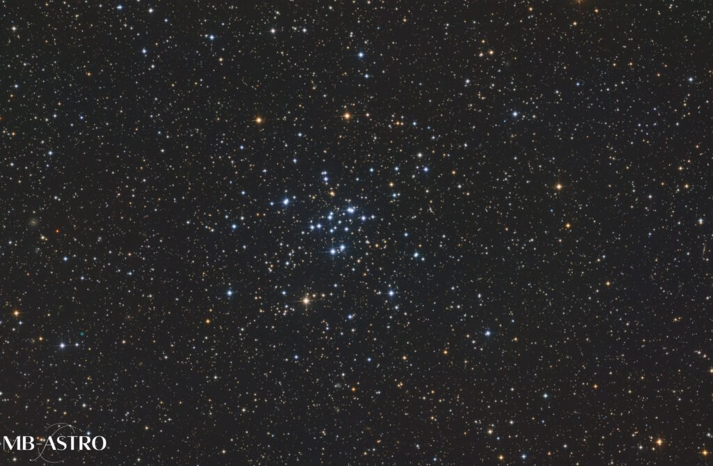 Auch die Eckdaten sind schön greifbar: M 34 ist relativ nah mit grob 1400 bis 1500 Lichtjahren Entfernung und mit einer Helligkeit um 5 Komma 2 bis 5 Komma 5 mag ein dankbares Objekt. Sein Alter liegt ungefähr bei 200 Millionen Jahren, je nach Studie auch etwas darüber, und genau das spürt man im Bild und im Okular: viele heißere weiß blaue Sterne, dazwischen aber auch schon gelblichere Töne, als würde der Haufen langsam erwachsen werden.