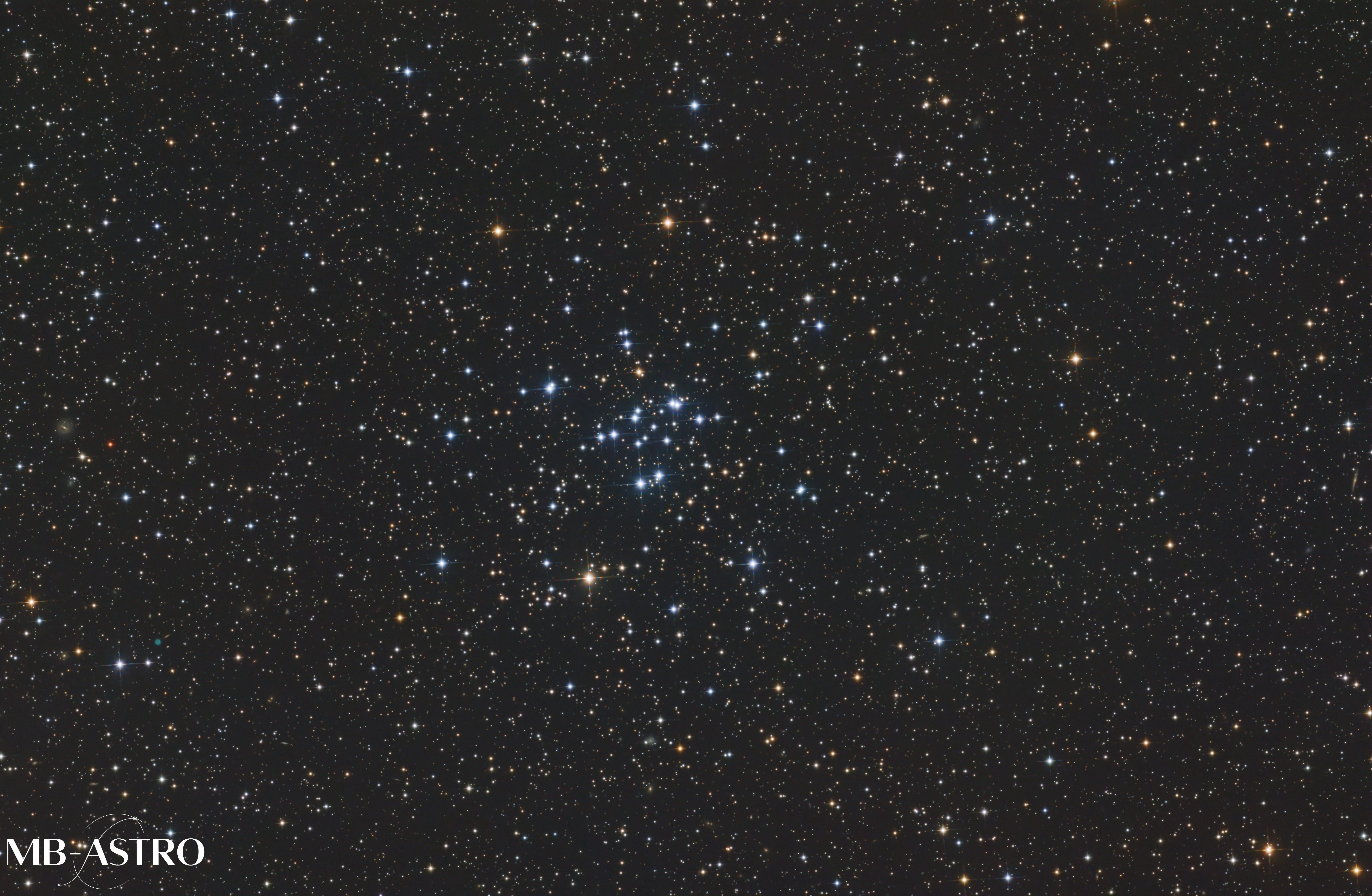 Messier 34, auch als NGC 1039 bekannt, ist ein offener Sternhaufen im Sternbild Perseus, nahe der Grenze zur Andromeda. Du findest ihn ungefähr auf halber Strecke zwischen Algol und Almach, also in einer Gegend, die sich richtig gut zum Starhopping eignet.